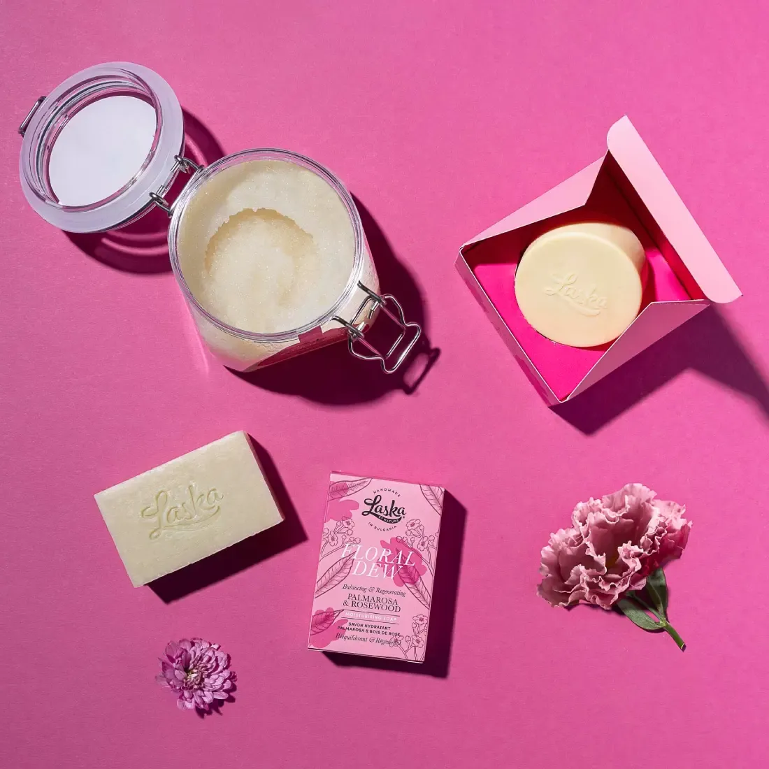 Sodium Olivate, Sodium Cocoate, Sodium Sheabutterate, Sodium Sunflowerseedate, Sodium Cocoa Butterate, Aqua, Glycerin***, Montmorillonite, Aniba Rosaeodora oil*, Cymbopogon Martini Oil**, Pelargonium Graveolens Oil**, Linalool***, Geraniol***, Limonene***, Benzyl benzoate***, Citral***, Capsicum Annuum Fruit Extract